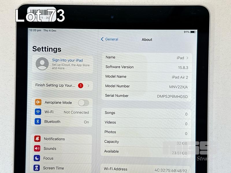APPLE iPAD AIR 2, 32GB, Wi-Fi, SPACE GREY, MODEL MNV22X/A, A1566 (NO CABLE, NO CHARGER) S/N:DMPSJP0MHG5D