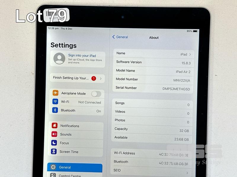 APPLE iPAD AIR 2, 32GB, Wi-Fi, SPACE GREY, MODEL MNV22X/A, A1566 (NO CABLE, NO CHARGER) S/N:DMPSJMETHG5D