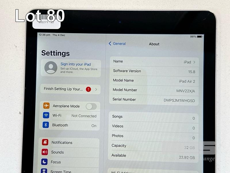 APPLE iPAD AIR 2, 32GB, Wi-Fi, SPACE GREY, MODEL MNV22X/A, A1566 (NO CABLE, NO CHARGER) S/N:DMPSJM1WHG5D