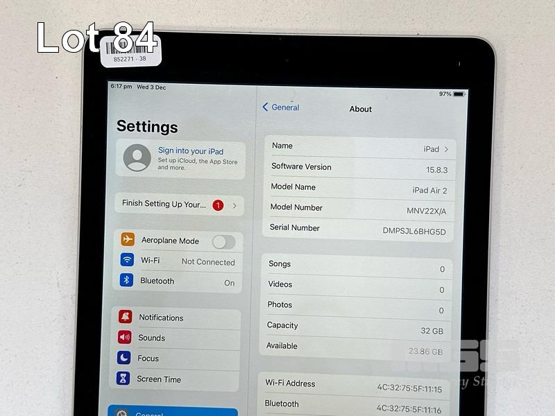 APPLE iPAD AIR 2, 32GB, Wi-Fi, SPACE GREY, MODEL MNV22X/A, A1566 (NO CABLE, NO CHARGER) (NOTE: MINOR SCRATCHES ON SCREEN) S/N:DMPSJL6BHG5D
