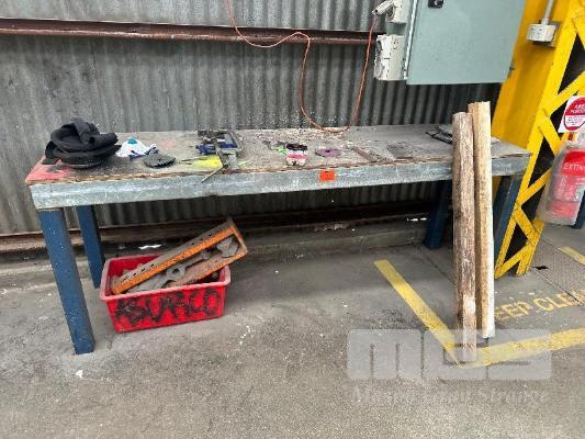 PAIR STEEL FRAME BENCHES, PLYWOOD TOPS, 1400 (L) x 620 (D) x 820mm (H) & 2300 (L) x 620 (D) x 820mm (H)