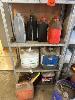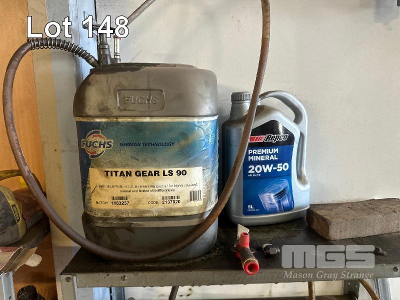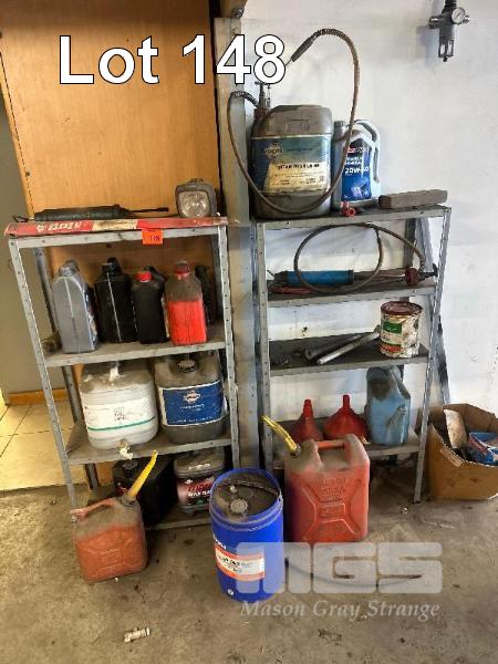 2 x GALV SHELF UNITS & CONTENTS, ASSORTED OILS, ENGINE & GEAR, DRUM PUMP, 2 x GREASE GUNS, 20 LITRE JERRY CAN, WATER JUGS, WIPER BLADES & ASSORTED TRAILER HUBS