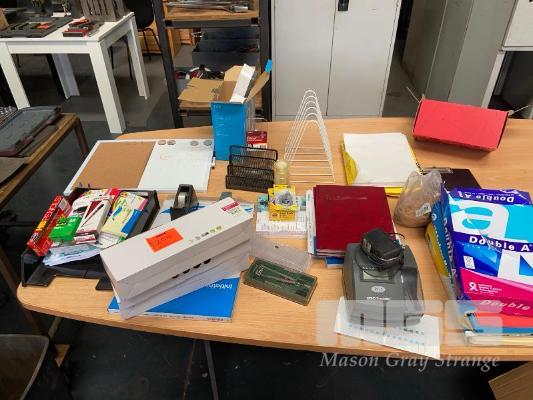 ASSORTED OFFICE SUNDRIES, LOGITECH SPEAKERS, PENS, SEIKO TIME CLOCK, PAPER, ETC