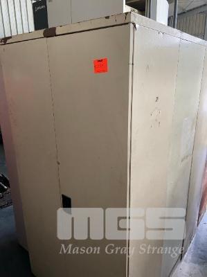 4 x STEEL STOCK CUPBOARDS, 2 DOOR & TIMBER 2 DOOR CUPBOARD