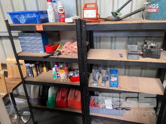 2 x MODULAR SHELF UNITS & CONTENTS INCLUDING PAINTS, OIL, DRAWER SETS, PAINT ROLLERS, CASTORS & HYDRAULIC PUMPS