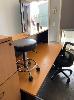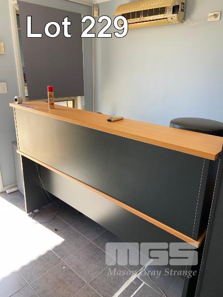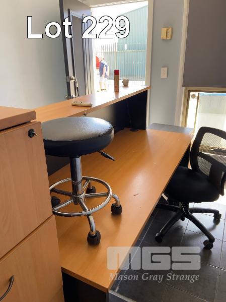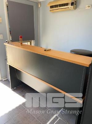TIMBER LAMINATE RECEPTION COUNTER, 3 DRAWER MOBILE, 4 DRAWER FILING CABINET, BOOK SHELF, ROUND MEETING TABLE, 2 x VISITORS CHAIR & GAS LIFT OFFICE CHAIR AND SMALL STOOL .