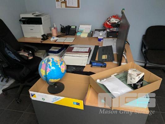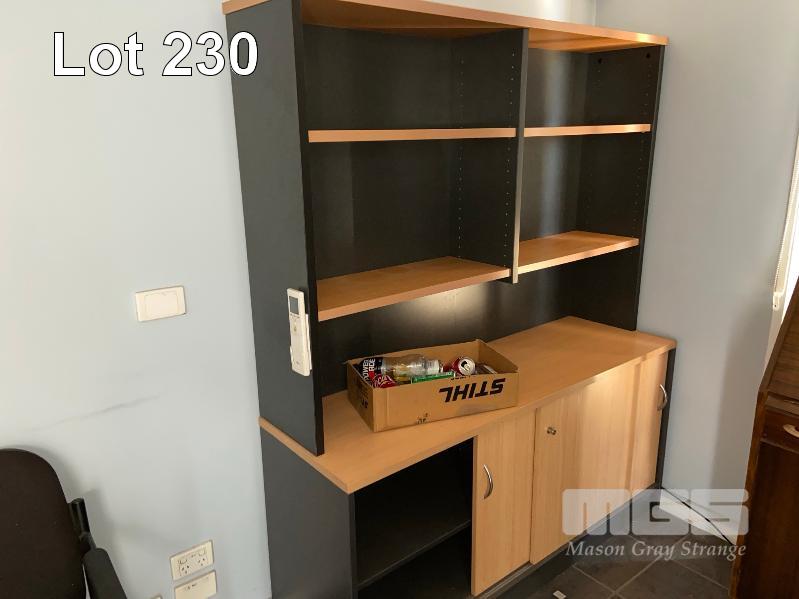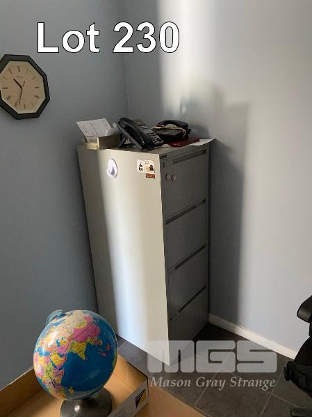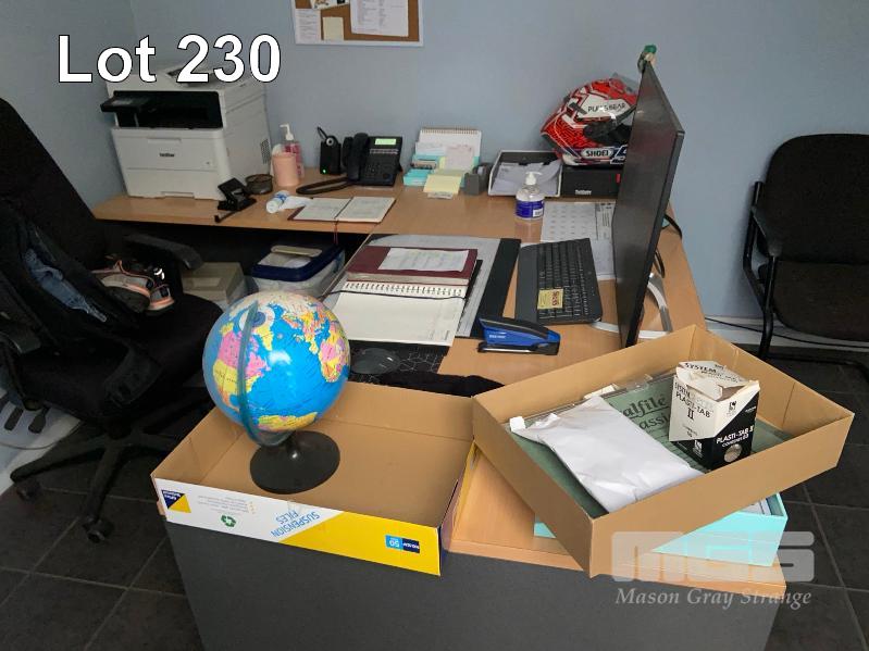 TIMBER LAMINATE DESK & RETURN, 1800 x 1900mm, SIDE CABINET, 2 DOOR, 2 SHELF, 2 x STEEL 4 DRAWER FILING CABINETS, VISITORS CHAIR & GAS LIFT CHAIR