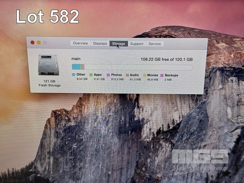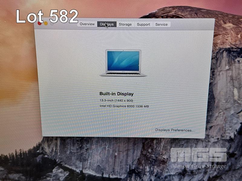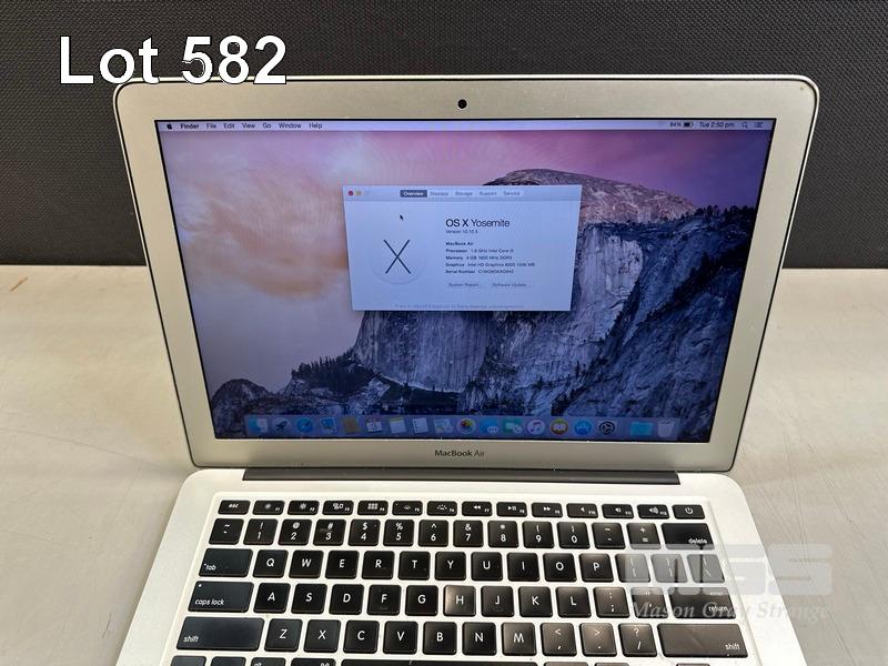 LAPTOP, APPLE MACBOOK AIR (A1466), CORE i5 5250U (5TH GEN) @ 1.6GHz, 4GB DDR3 RAM, 128GB SSD, 13.3" DISPLAY (1440x900), INTEL HD GRAPHICS 6000, Wi-Fi, BLUETOOTH, MAC OS 10.10 INSTALLED & POWER SUPPLY (NOTE: SCREEN HINGES LOOSE) S/N:C1MQ9DKXG940