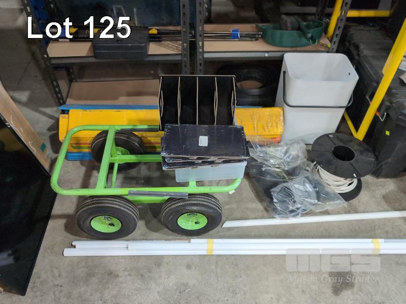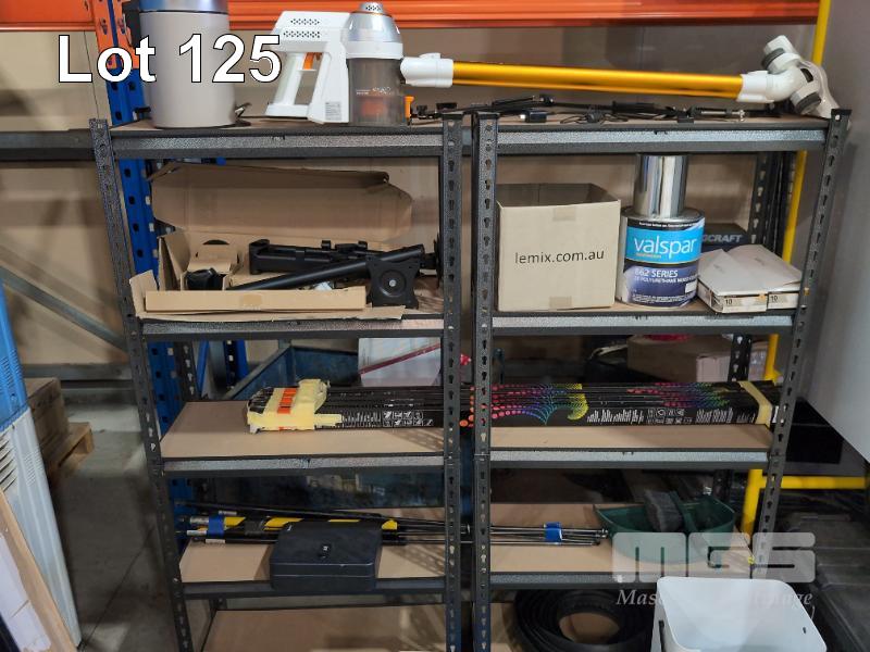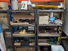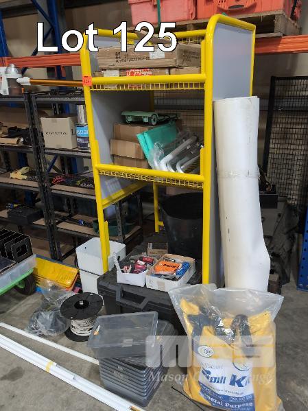ASSORTED WAREHOUSE MAINTENANCE ITEMS INCLUDES 2 X 4-TIER SHELF UNITS, SHELVING UNIT, DOLLY, SPILL KIT, FLUORESCENT TUBES, TIE-DOWN CORNER PROTECTORS, STORAGE TUBS, RUBBER SHEET, ETC
