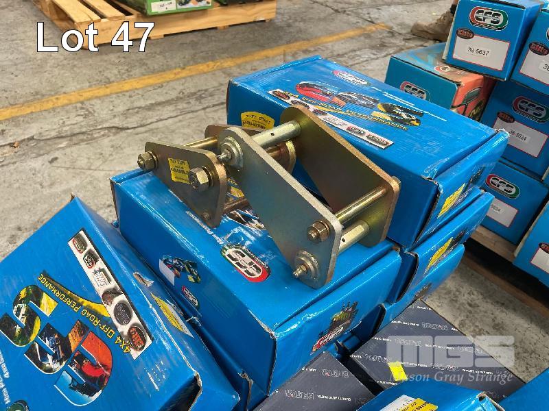 PALLET EFS SUSPENSION SHACKLES INCLUDING 4 x GR357-GEN 78/79# STD GENUINE RRP $60.00/UNIT 10 x GR358EX REAR LATE CRUISER RRP $115.00/UNIT 8 x GR384EX FRONT LUX LEAF SPRING RRP $80.00/UNIT 4 x GR386EX REAR LUX / HOL -97 RRP $81.00/UNIT 5 x GR387EX REAR LUX ALL 05- RRP $84.00/UNIT 6 x GR388 REAR D40 NAVARRA 06- RRP $64.00/UNIT 6 x GR390 REAR COLORADO / DMAX RRP $67.00/UNIT 8 x GR394 REAR LUX REVO 16- RRP $ 67.00/UNIT 3 x GR470 FRONT AND REAR NIS LEAF ALL RRP $19.00/UNIT 5 x GR656 FRONT AND REAR SUZ SIERRA RRP $ 36.00/UNIT 4 x GR664 REAR NIS PATROL MQ RRP $ 101.00/UNIT 2 x GR665 FRONT NIS PATROL 8/83- RRP $85.00/UNIT 3 x GR667 FRONT AND REAR G60/Y60 UTE RRP $ 36.00/UNIT 6 x 04483-60070GR F/HJ75 GREASEABLE RRP $ 39.00/UNIT 16 x 04483-60070LEXGR EXTENDED SHACKLE 50mm OFF ROAD USE RRP $ 100.00/UNIT 15 x 04483-60070REXGR EXTENDED SHACKLE 50mm OFF ROAD USE RRP $100.00/UNIT 8 x 04481-60012EXGR EX SHACKLE OFF ROAD USE ONLY RRP $ 42.00/UNIT 1 x PALLET PLEASE NOTE: CONTENTS ARE ESTIMATED
