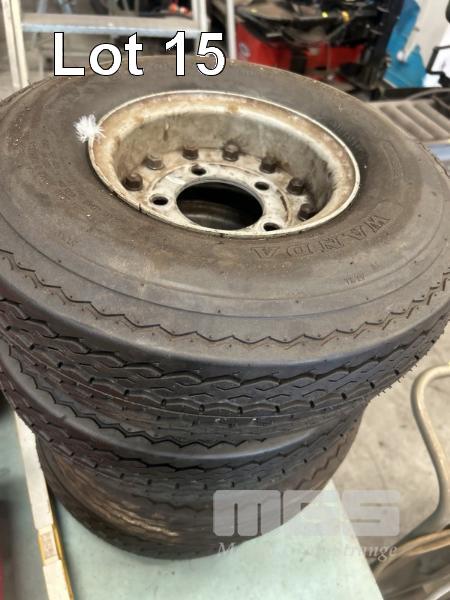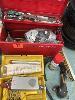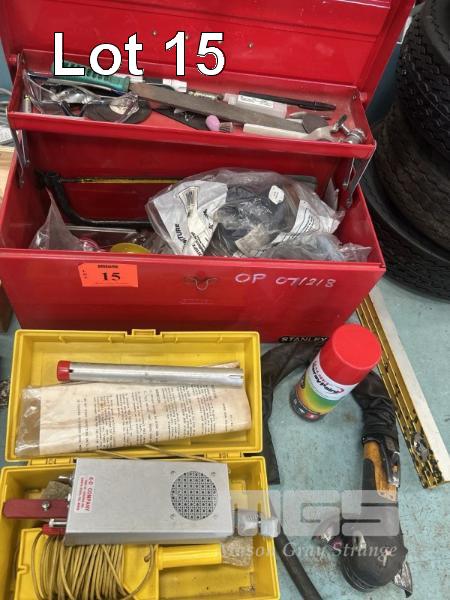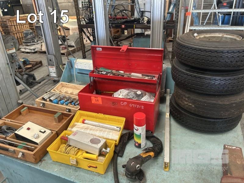 TOOL BOX & ASSORTED HAND TOOLS, PIPE THREAD FITTING GAUGE SET, OPTICAL BORESCOPE, UNION, PROTECTIVE COATING DEFECT DETECTOR, 4 x CART TYRES & RIMS, SIZE 5.70-8, ETC