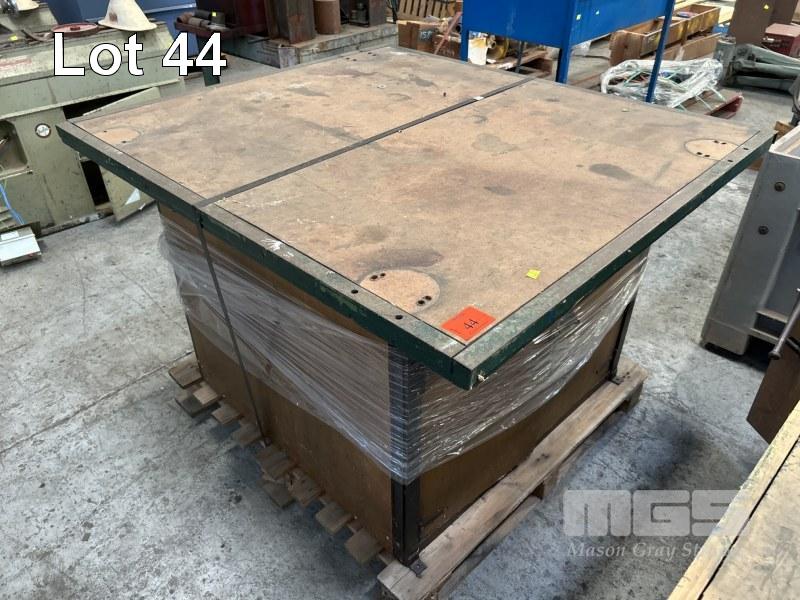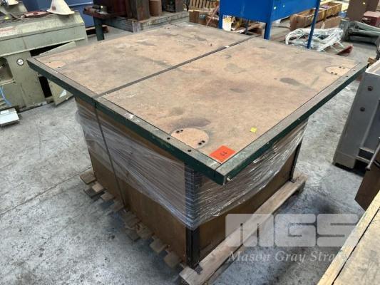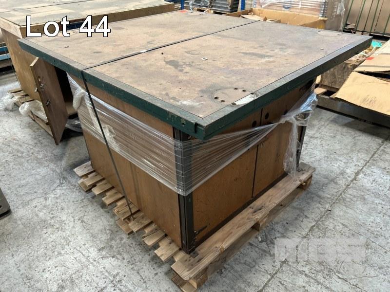 TIMBER WORK BENCH, 1250 x 1400 x 830mm DOUBLE SIDED WITH CUPBOARDS BOTH SIDES