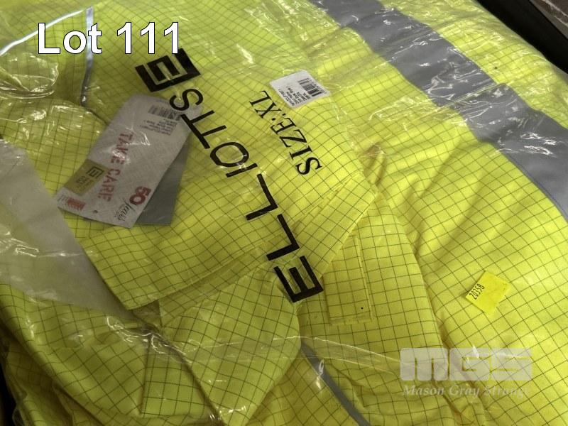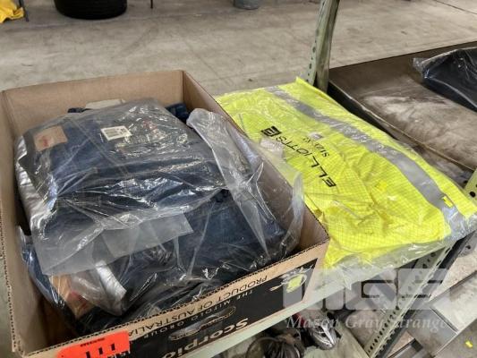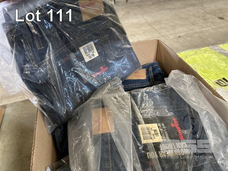 WORKWEAR INCLUDING 2 x HI-VIS WET WEATHER JACKETS, ELLIOTS SIZE: XL, 5 x PAIRS DENIM JEANS, KING GEE SIZE: 107R BLUE WITH REFLECTIVE TAPE AS NEW