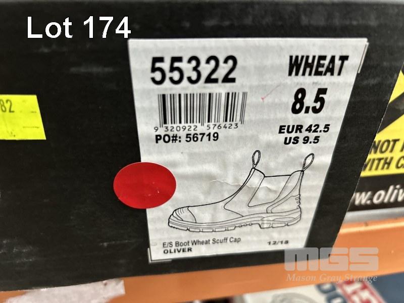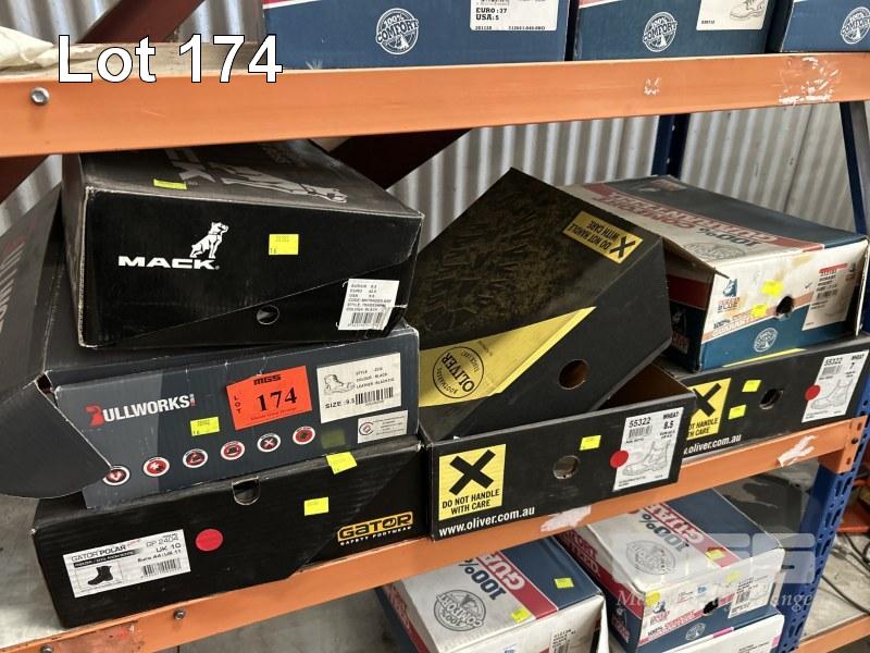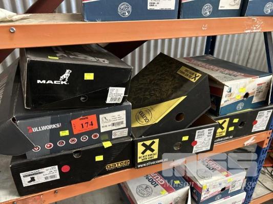 6 x PAIRS STEEL CAP WORK BOOTS PAIR BULLWORKS BLACK LEATHER, SIZE 9.5, PAIR MACK STEEL CAPS, SIZE USA 9.5, PAIR GATOR FOOTWEAR, SIZE USA 11, PAIR STEEL BLUE, SIZE USA8.5 & 2 x PAIRS OLIVER, COLOUR WHEAT, SIZE 8.5