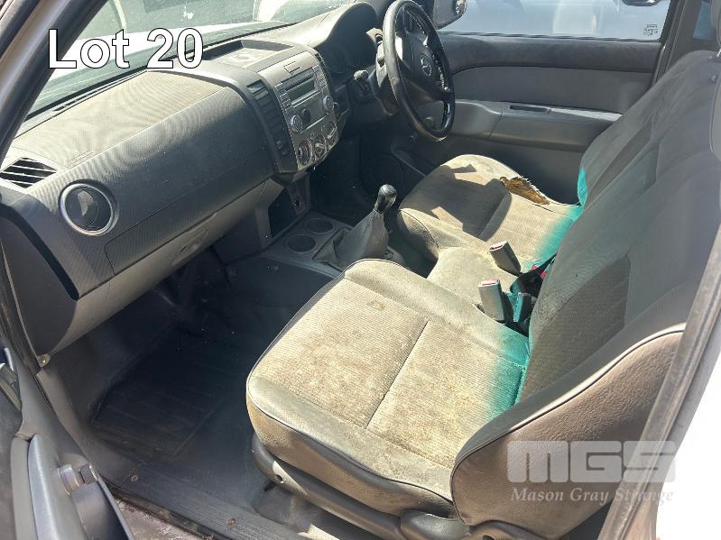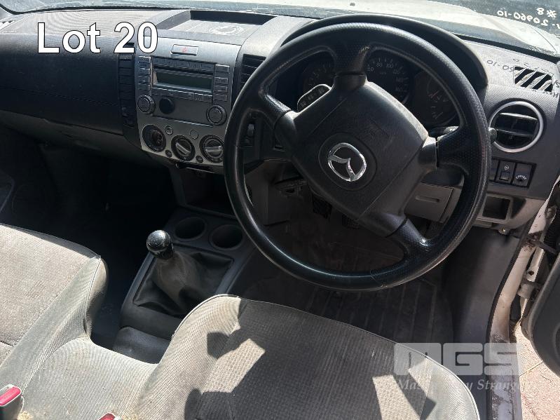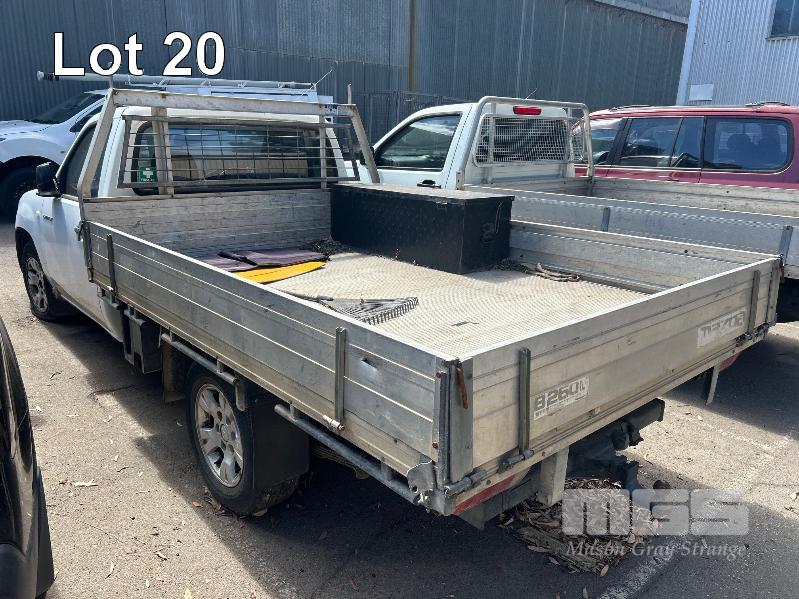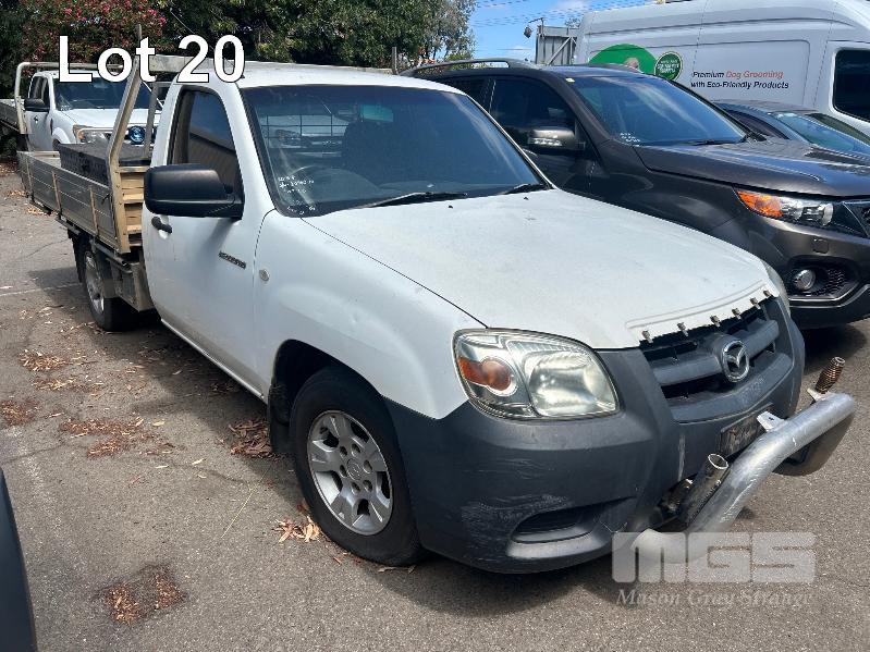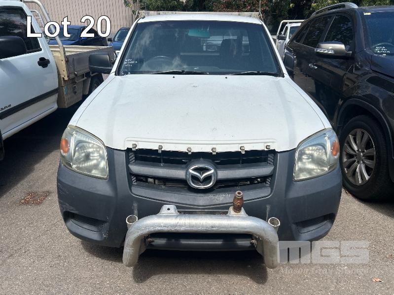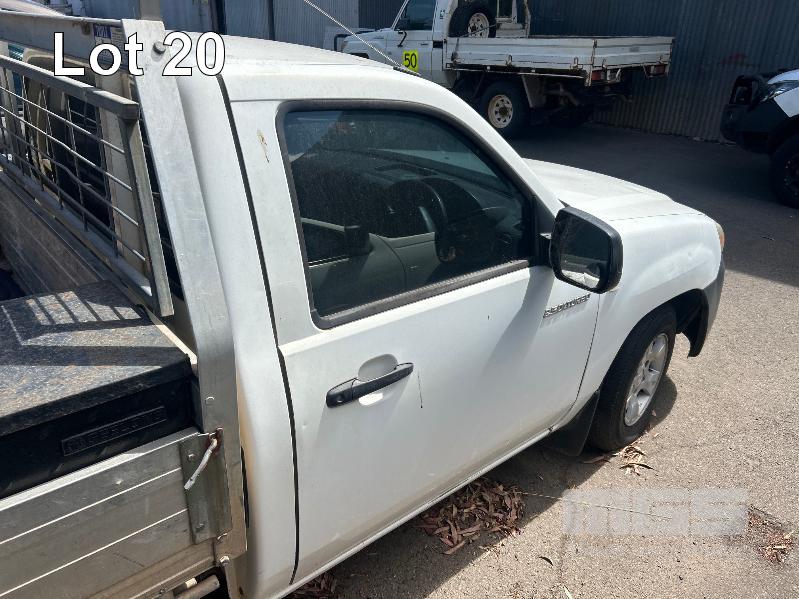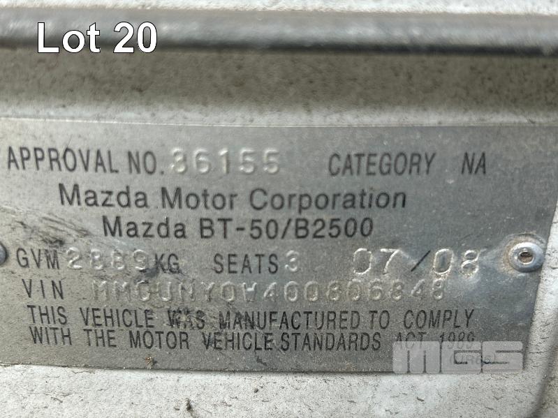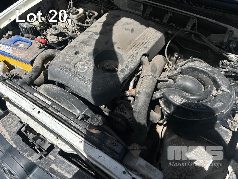 2003 MAZDA BT50/B2500 SINGLE CAB TRAY TOP REG: NO PLATES VIN: MM0UNY0W400806848 ODO: 346,527kms SHOWING 4 CYLINDER DIESEL, 5 SPEED MANUAL TRANSMISSION, WHITE DUCO, 2 DOORS, 3 SEAT, AIR BAG, AIR CON, ALLOY TRAY, CD PLAYER, CENTRAL LOCKING, NUDGE BAR, POWER STEERING, POWER WINDOWS, SPARE WHEEL, SPOT LIGHTS, TOOL BOX, TOW BAR, KEY #8 (WITH 1 KEY/S) CONDITION: ENGINE - TURNS OVER BUT WONT START TYRES - 2 x FLAT
