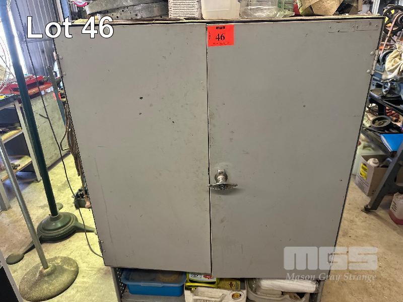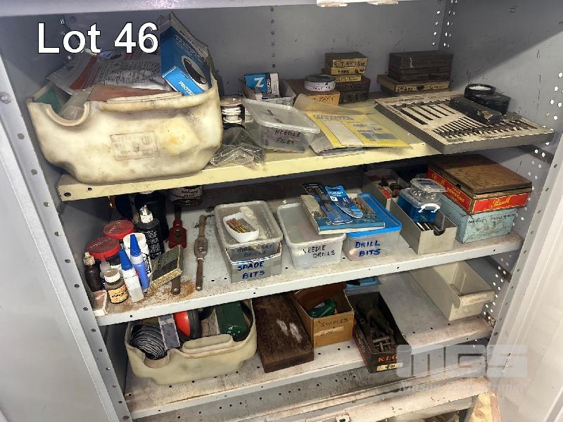 STEEL CABINET, 2 DOOR & CONTENTS INCLUDING NEEDLE & GP DRILL BITS, TRAPS, DIES, LUBES, GLUES, ETC