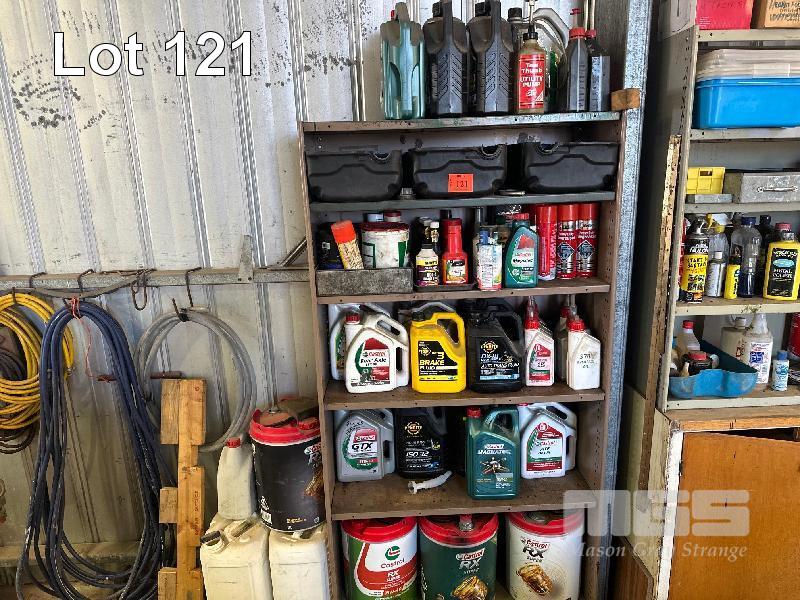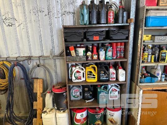 STEEL SHELF UNIT & HUGE QUANTITY OILS FLUIDS, DEGREASER, 5-20 LITRE PART DRUMS