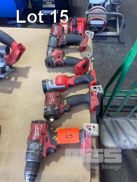 2 x MILWAUKEE 18V DRILLS, TEK GUN, IMPACT GUN 1/2", TORCH & CHARGER, NO BATTERIES