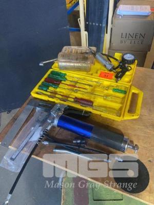 DRIVER SET, AIR FITTINGS, GREASE GUN, DIGITAL VERNIER & SET SQUARE