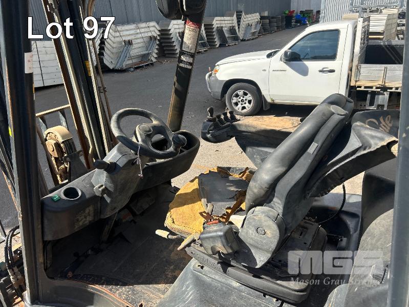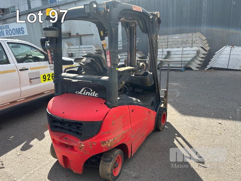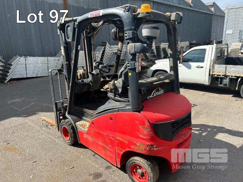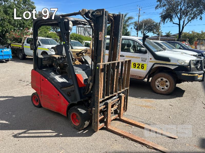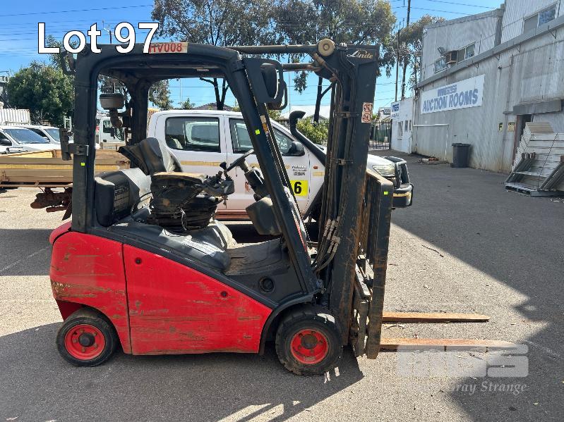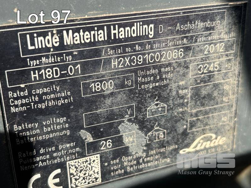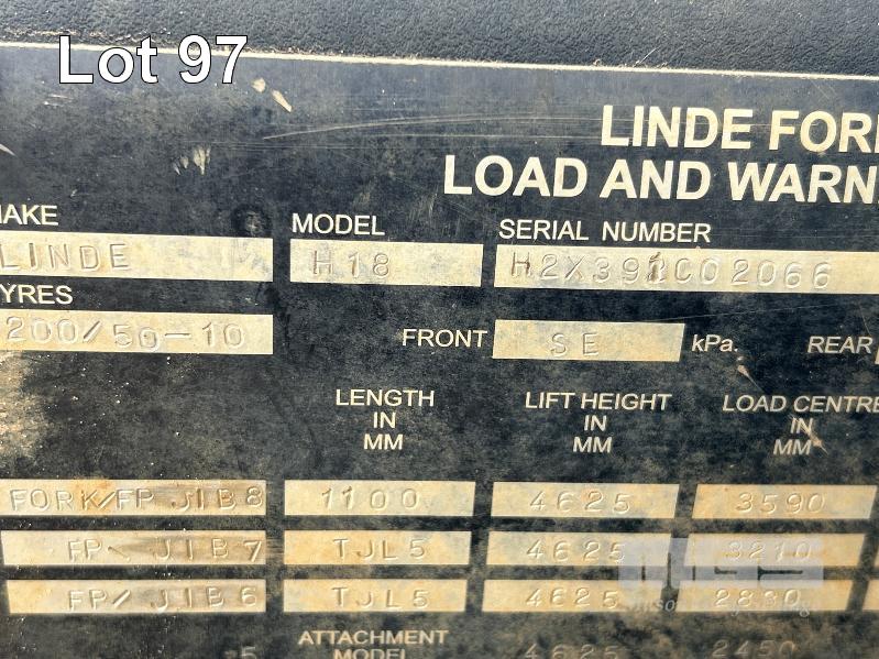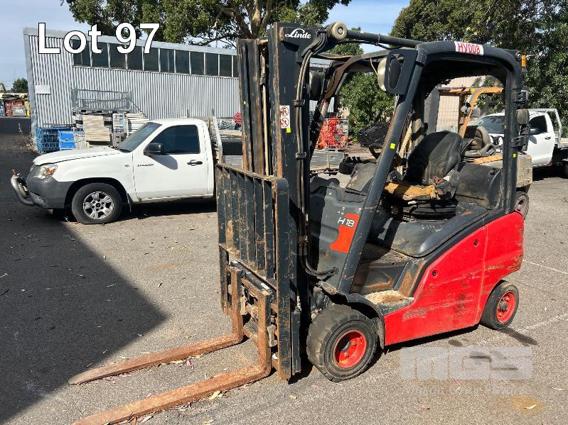 2012 FORKLIFT, LINDE MOD: H18D-01 S/NO: H2X391C02066 1.8T POWERED BY 26kw DIESEL ENGINE 2 STAGE CONTAINER MAST WITH TYNE POSITIONING & SIDE SHIFT SOLID TYRES MAX LIFT CAP RATED: 1400kg @600mm LOAD CENTRE MAX LIFT HEIGHT: 4625mm NOTE: ALL FAULTS NOT WORKING, POSSIBLE ENGINE/TRANSMISSION FAULT
