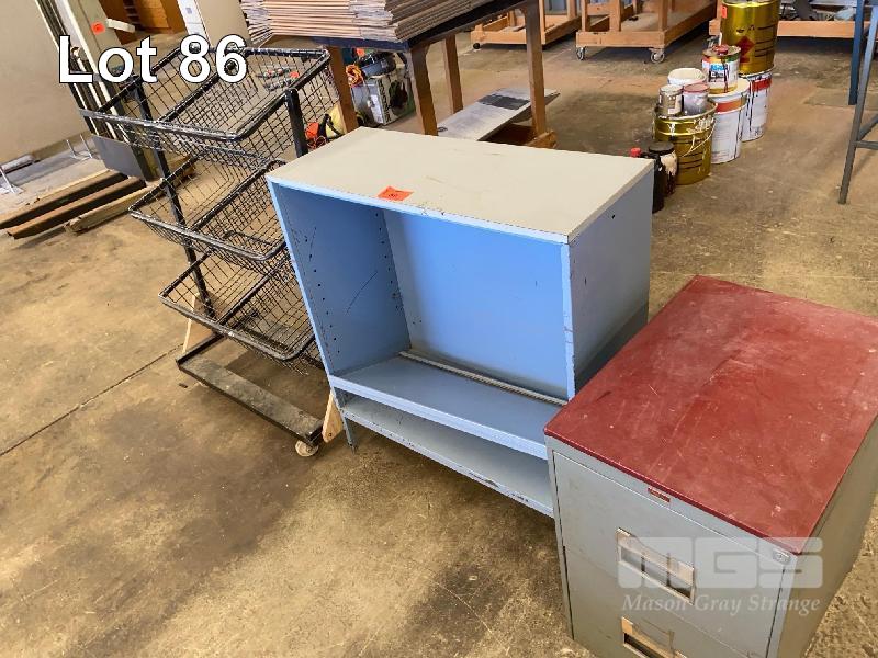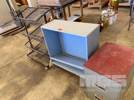 BASKET TROLLEY, STEEL SHELF UNIT & FILE CABINET