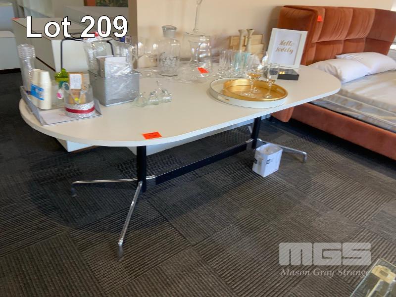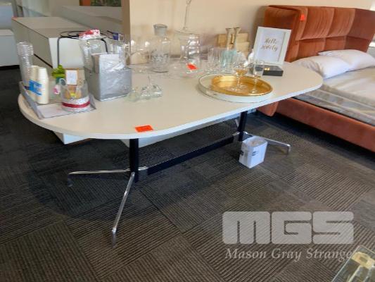 WHITE LAMINATE & CHROME BASE TABLE, 2200 x 100mm & 6 CHAIRS