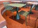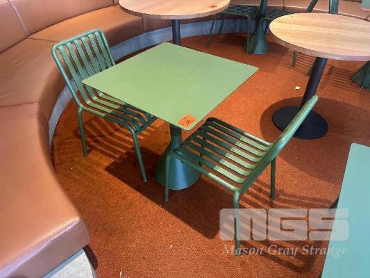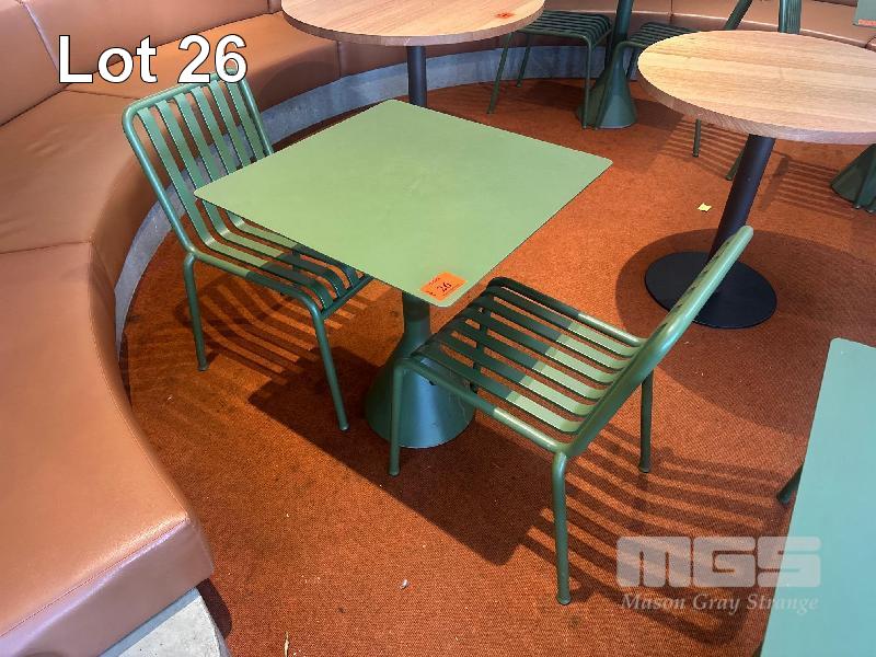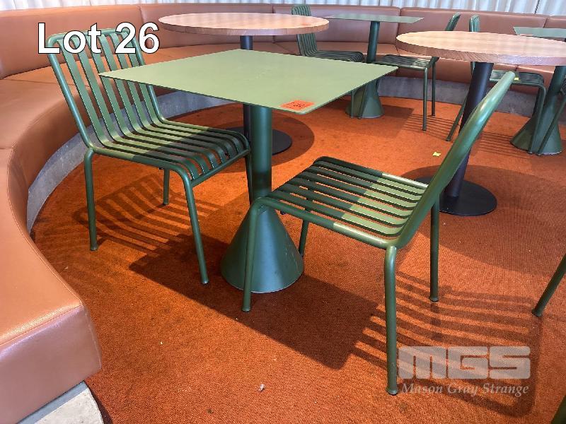 HAY CAFE TABLE, 650 x 650 x 740mm (H), STEEL FRAME & TOP, OLIVE GREEN, CONCRETE PEDESTAL BASE & 2 x HAY CHAIRS