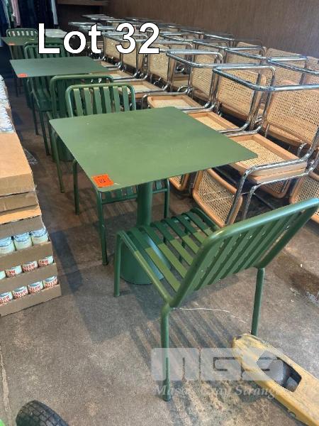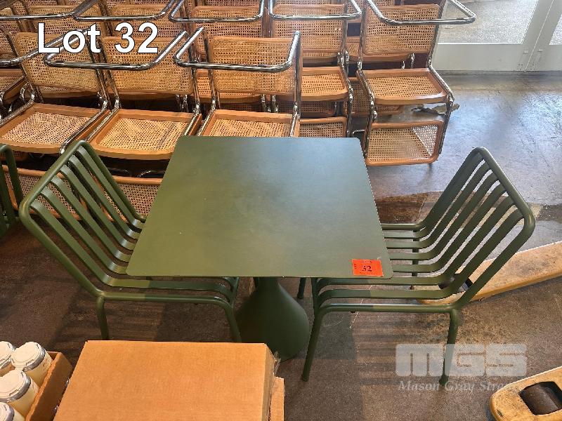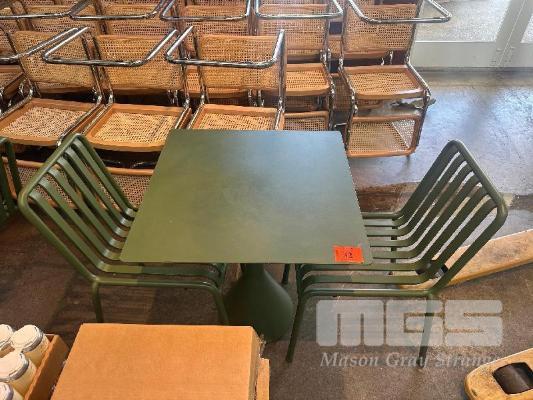 HAY CAFE TABLE, 650 x 650 x 740mm (H), STEEL FRAME & TOP, OLIVE GREEN, CONCRETE PEDESTAL BASE & 2 x HAY CHAIRS