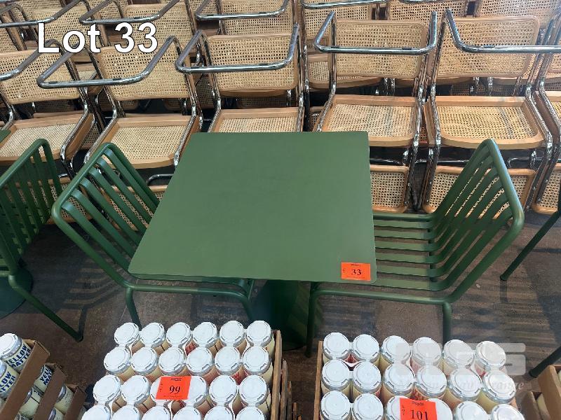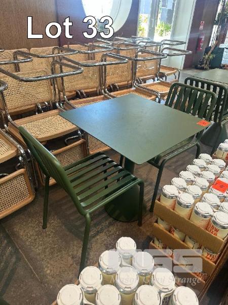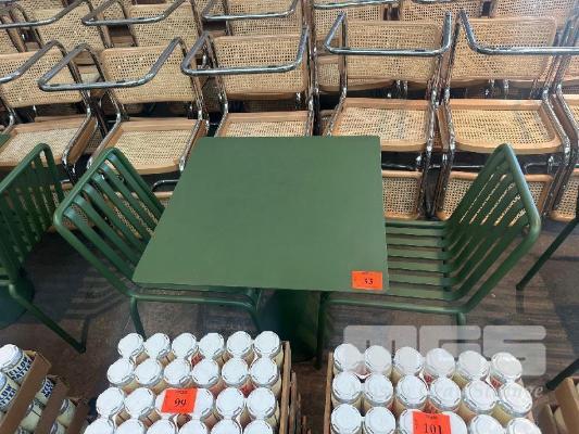 HAY CAFE TABLE, 650 x 650 x 740mm (H), STEEL FRAME & TOP, OLIVE GREEN, CONCRETE PEDESTAL BASE & 2 x HAY CHAIRS