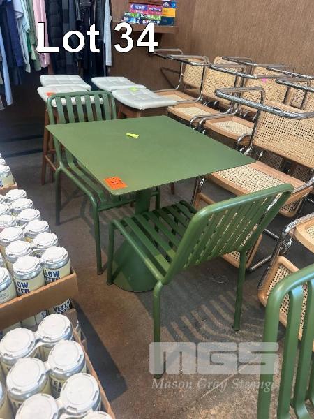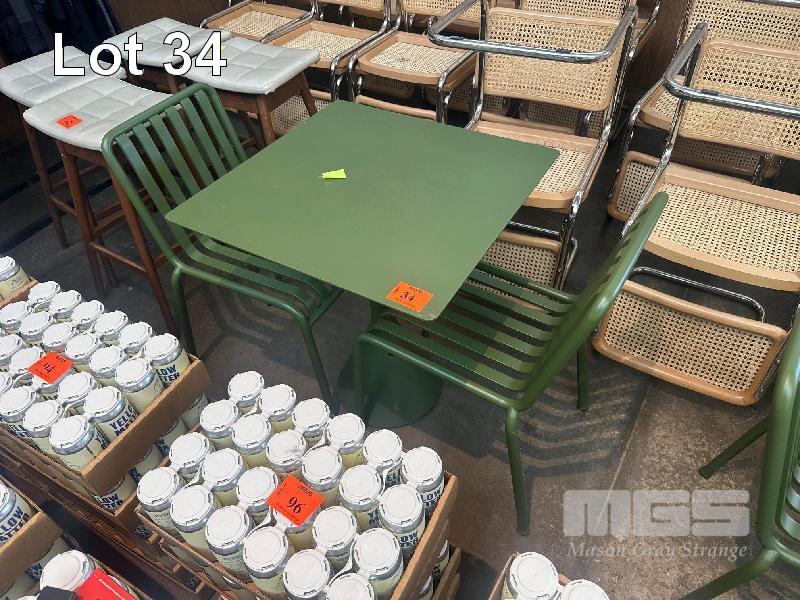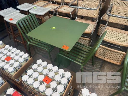 HAY CAFE TABLE, 650 x 650 x 740mm (H), STEEL FRAME & TOP, OLIVE GREEN, CONCRETE PEDESTAL BASE & 2 x HAY CHAIRS