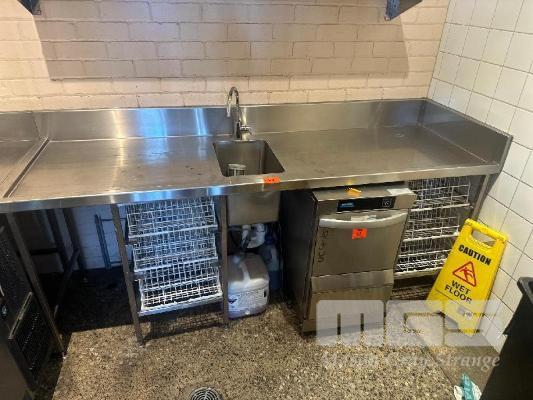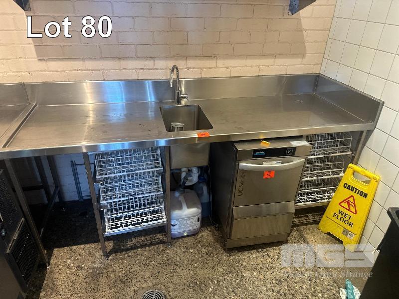 STAINLESS STEEL BENCH WITH HAND WASH BASIN & SPLASHBACK, 2200 x 700mm & GLASS RACK STORAGE