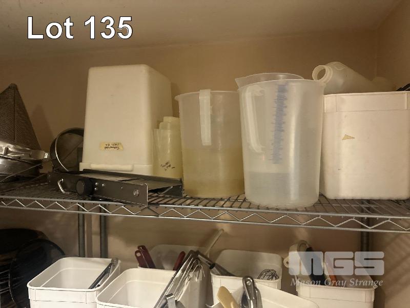 LARGE QUANTITY KITCHEN SUNDRIES, STOCK POTS, CUTTING BOARDS, SIEVES, JUGS, BOWLS, ETC