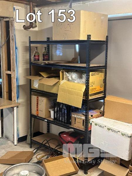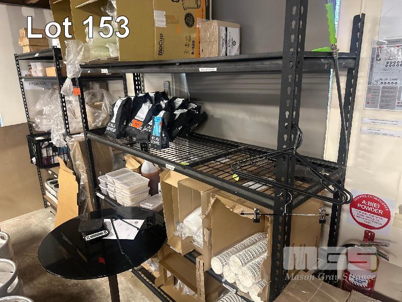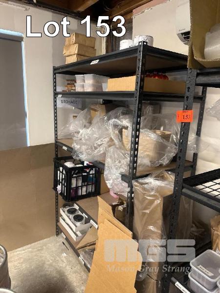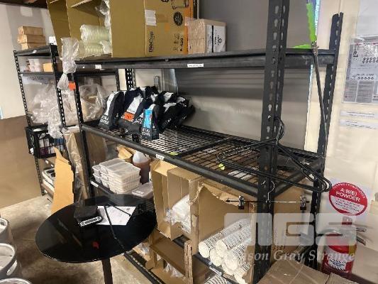 3 x STORAGE RACKS, 4 TIER & CONTENTS CLEANING PRODUCTS, TAKEAWAY CONTAINERS, DOCKET PRINTER PAPER, ETC