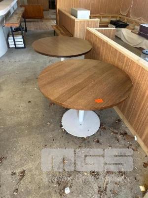 2 x CAFE TABLES, 1100mm (D) TIMBER TOP, WHITE STEEL BASE,