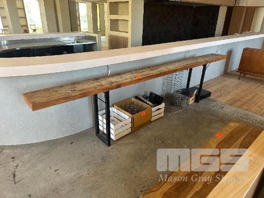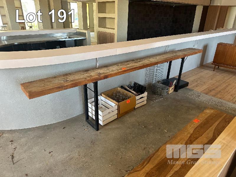 LARGE SINGLE PIECE SOLID TIMBER BENCH, 3800 x 320 x 870mm (H), BLACK STEEL FRAME