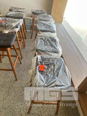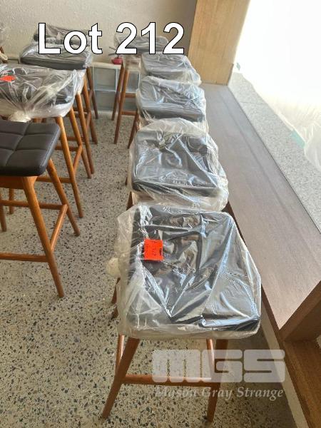 5 x TIMBER BAR STOOLS, WORK FORCE, BLACK LEATHER TOPS, 700mm (H)
