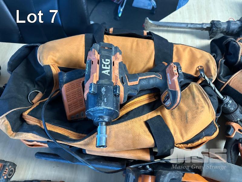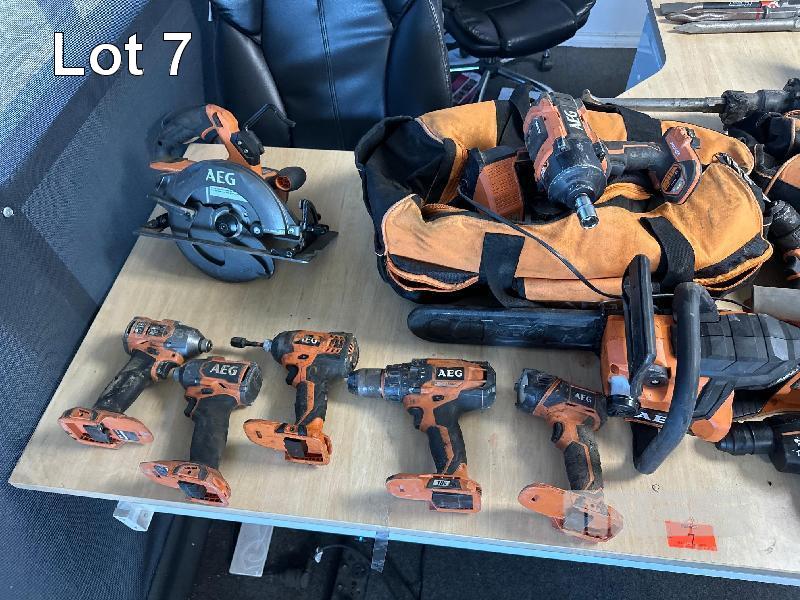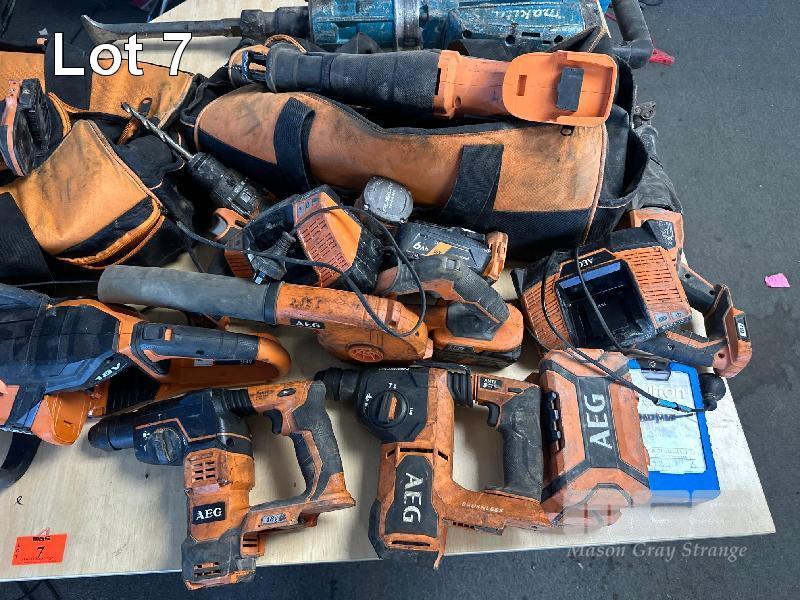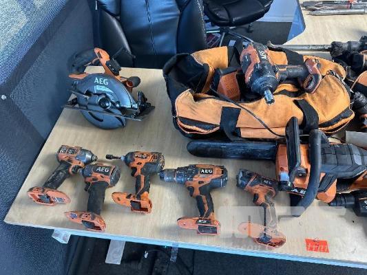 AEG 18V TOOL SET, 3 x TEK GUNS, 3 x DRILLS, 2 x HAMMER DRILLS, 1 x TORCH, 1 x IMPACT GUN, 1 x BLOWER, 1 x CHAINSAW, 1 x CIRCULAR SAW, 2 x RECIPRO SAW, 2 x 6.0aH BATTERIES, 2 x CARRY BAGS, 2 x CHARGERS