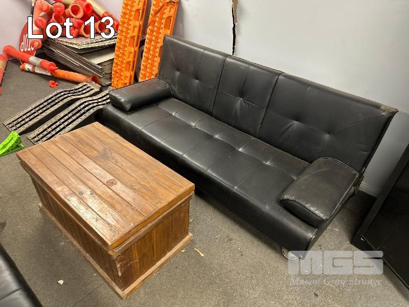 ALL THE FURNITURE!, 2 x BLACK LEATHER SEATS WITH FOOT RESTS, 2 x 3 SEATER BLACK LEATHER LOUNGES, 1 x TIMBER SIDE TABLE, 1 x TIMBER COFFEE TABLE/CHEST, 1 x WARDROBE, 1 x STEEL FILING CABINET, SQUARE TABLE & CHAIRS, 1 x MOBILE DRY BAR (CABLE REEL)