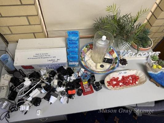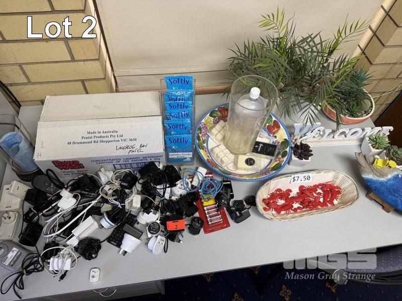 SUNDRIES INCLUDING ASSORTED PHONE CHARGERS & CABLES, LAUNDRY DETERGENT SACHETS, IMITATION PLANTS, ETC