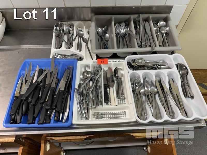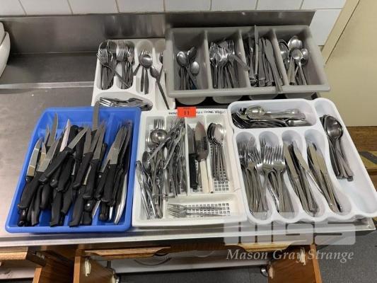 CUTLERY, LARGE QUANTITY KNIVES, FORKS, SPOONS, STEAK KNIVES