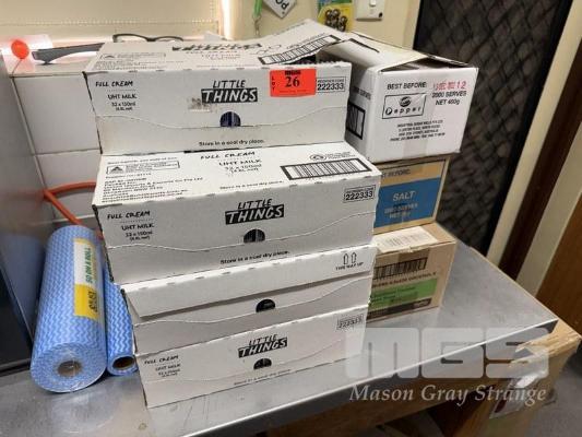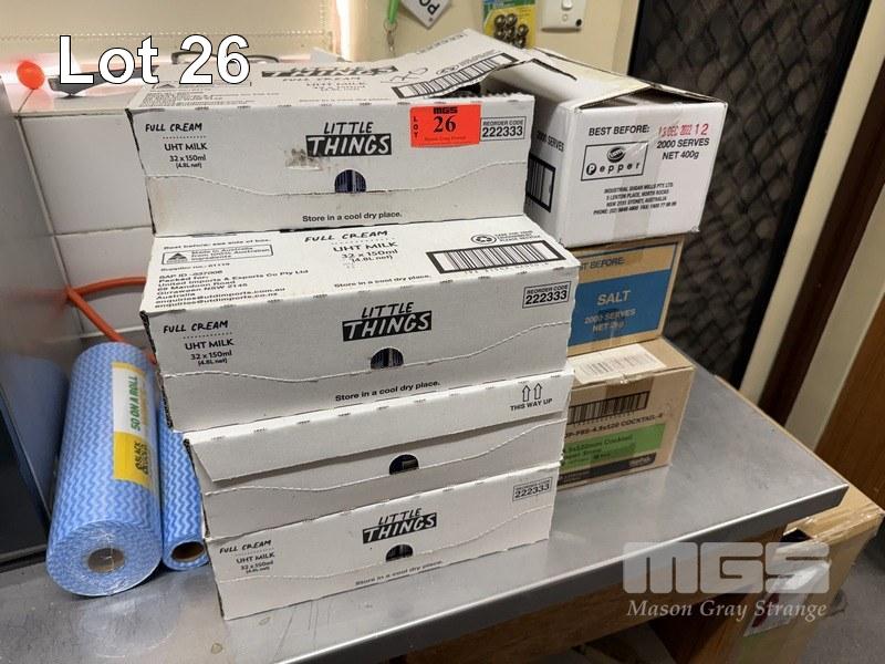 7 x CARTONS UHT MILK, 150ml, 128 TOTAL EXPIRY AUGUST 2026, SALT & PEPPER SACHETS, BOX BIOPAK DINNER BOX, BOX OF STRAWS