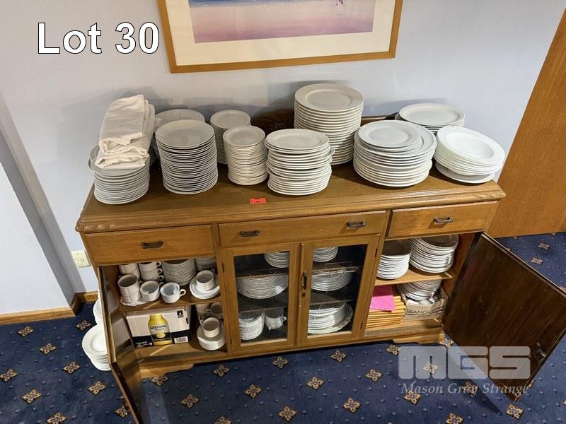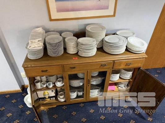 LARGE QUANTITY CROCKERY, CONTENTS BUFFET CABINET, BOWLS DINNER & SIDE PLATES, COFFEE CUPS, SAUCERS & SALT & PEPPER SHAKERS