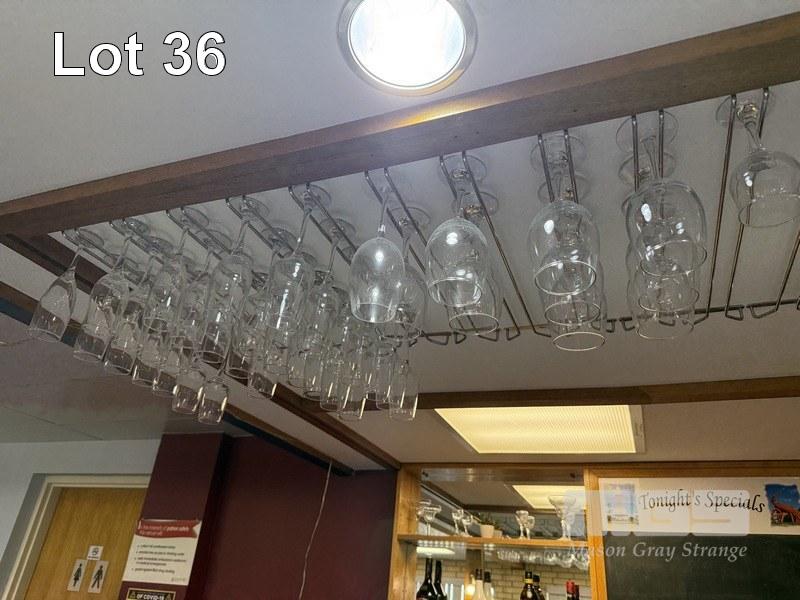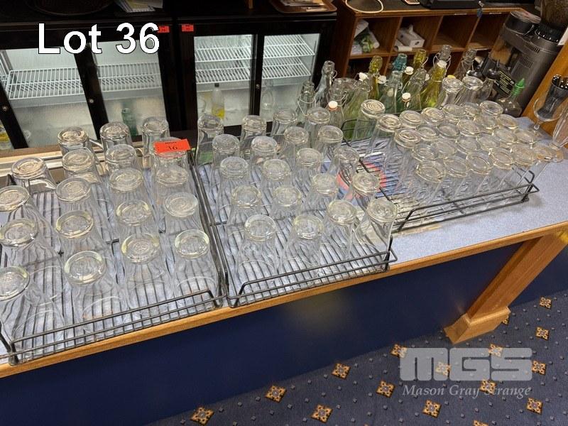 QUANTITY OF GLASSWARE IN BAR AREA, CHAMPAGNE FLUTES, WHITE & RED WINE, HIGH BALL, PINT GLASSES, DAIQUIRI GLASSES & ASSORTED WATER BOTTLES