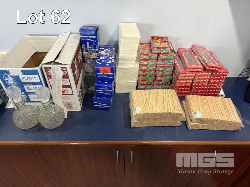 BAR SUNDRIES INCLUDING COASTERS, NAPKINS, COCKTAIL PARASOLS, COCKTAIL ANIMALS & 2 x DECANTERS