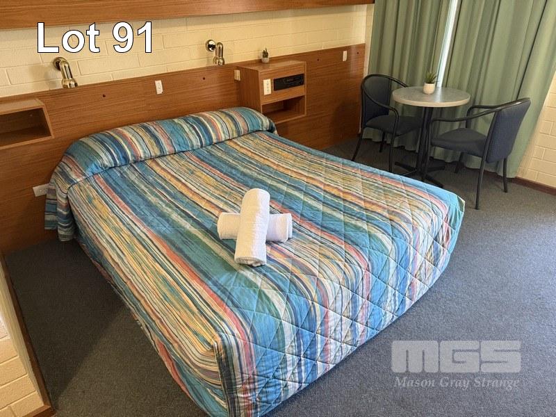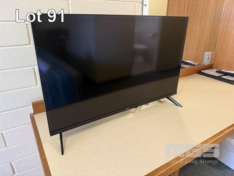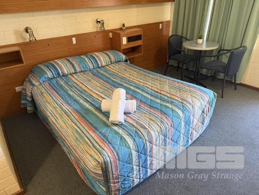 ROOM 202 QUEEN SIZE ENSEMBLE, CIRCULAR TABLE, 60cm, BLUE LAMINATE, 2 x ARM CHAIRS, FABRIC SEAT & BACK, TUBULAR STEEL FRAME, KOGAN TV, 32" (2024) MOD: KALED3229410A LEMAIR BAR FRIDGE, 130 LITRE, CORDLESS KETTLE, TOASTER, 2 SLICE, IRON & IRONING BOARD, COFFEE CUPS, SAUCER, WASTE PAPER BIN (EXCLUDES LINEN)