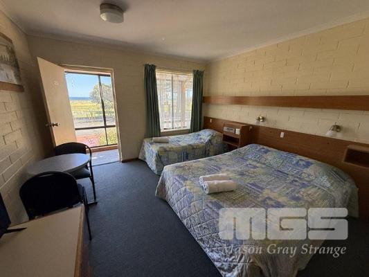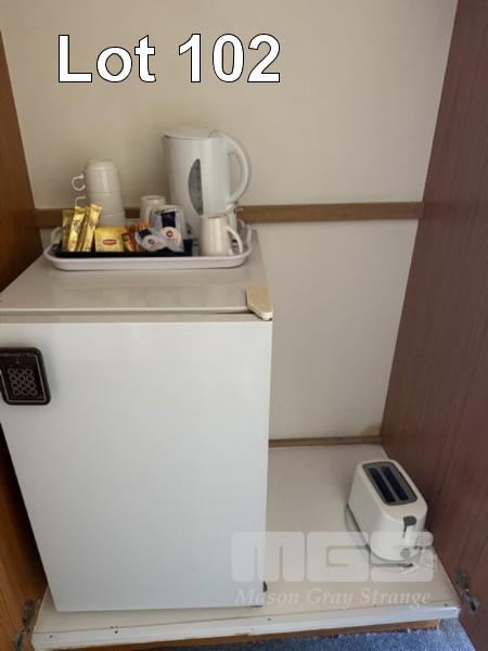 ROOM 209 QUEEN SIZE ENSEMBLE, CIRCULAR TABLE, 60cm, BLUE LAMINATE, 2 x ARM CHAIRS, FABRIC SEAT & BACK, TUBULAR STEEL FRAME, KOGAN TV, 32" (2024) MOD: KALED3229410A KENWOOD BAR FRIDGE, 130 LITRE, CORDLESS KETTLE, TOASTER, 2 SLICE, COFFEE CUPS, SAUCER, WASTE PAPER BIN SINGLE BED ENSEMBLE (EXCLUDES LINEN)