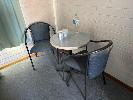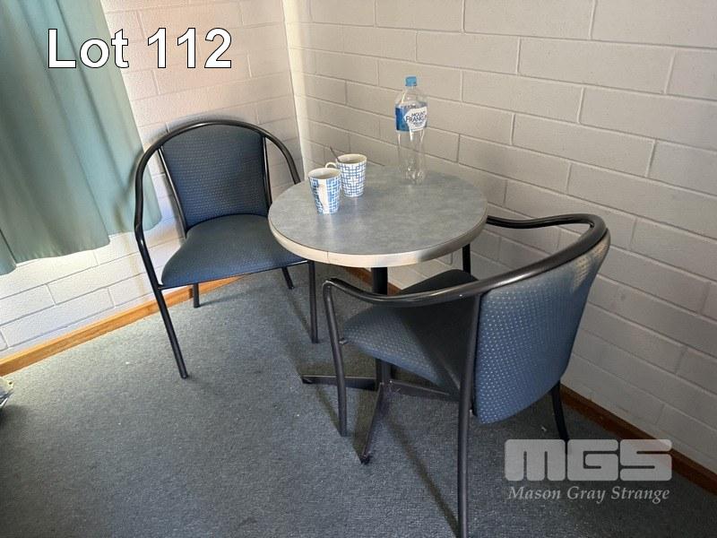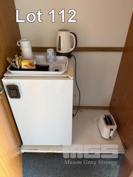 ROOM 117 QUEEN SIZE ENSEMBLE, CIRCULAR TABLE, 60cm, BLUE LAMINATE, 2 x ARM CHAIRS, FABRIC SEAT & BACK, TUBULAR STEEL FRAME, HISENSE TV, 32" (2024) KENWOOD BAR FRIDGE, 130 LITRE, CORDLESS KETTLE, TOASTER, 2 SLICE, COFFEE CUPS, SAUCER, WASTE PAPER BIN SINGLE BED ENSEMBLE PVC OUTDOOR CHAIR (EXCLUDES LINEN)