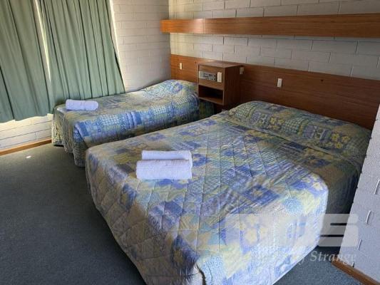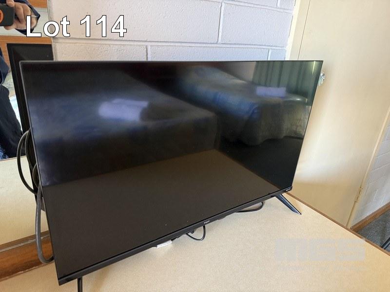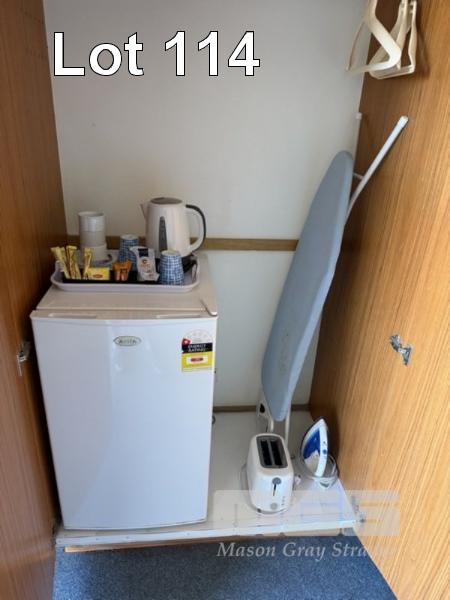 ROOM 119 QUEEN SIZE ENSEMBLE, CIRCULAR TABLE, 60cm, BLUE LAMINATE, 2 x ARM CHAIRS, FABRIC SEAT & BACK, TUBULAR STEEL FRAME, KOGAN TV, 32" (2024) MOD: KALED3229410A KENWOOD BAR FRIDGE, 130 LITRE, CORDLESS KETTLE, TOASTER, 2 SLICE, COFFEE CUPS, SAUCER, WASTE PAPER BIN IRON & IRONING BOARD SINGLE BED ENSEMBLE (EXCLUDES LINEN)