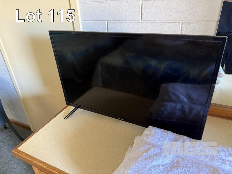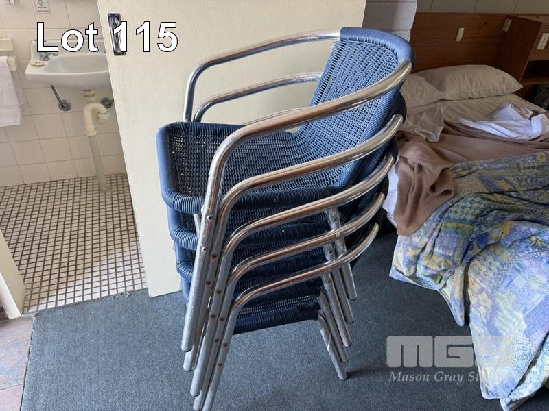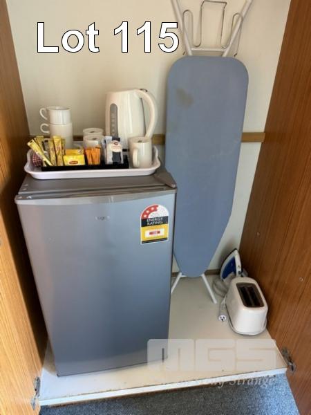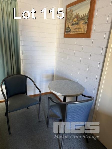 ROOM 120 QUEEN SIZE ENSEMBLE, CIRCULAR TABLE, 60cm, BLUE LAMINATE, 2 x ARM CHAIRS, FABRIC SEAT & BACK, TUBULAR STEEL FRAME, KOGAN TV, 32" (2024) MOD: KALED3229410A KENWOOD BAR FRIDGE, 130 LITRE, CORDLESS KETTLE, TOASTER, 2 SLICE, COFFEE CUPS, SAUCER, WASTE PAPER BIN IRON & IRONING BOARD SINGLE BED ENSEMBLE 5 x BLUE WICKER & ALUMINIUM ALFRESCO CHAIRS (EXCLUDES LINEN)