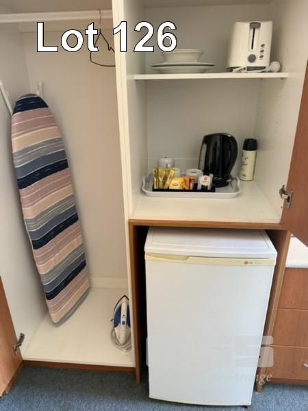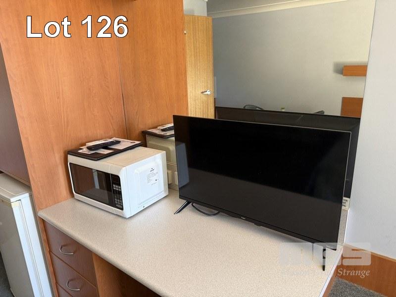 ROOM 126 QUEEN SIZE ENSEMBLE, CIRCULAR TABLE, 60cm, BLUE LAMINATE, 2 x ARM CHAIRS, FABRIC SEAT & BACK, TUBULAR STEEL FRAME, KOGAN TV, 32" (2024) MOD: KALED3229410A SAMSUNG MICROWAVE, 800w, LG BAR FRIDGE, 130 LITRE, CORDLESS KETTLE, TOASTER, 2 SLICE, IRON & IRONING BOARD, COFFEE CUPS, SAUCER, WASTE PAPER BIN (EXCLUDES LINEN)